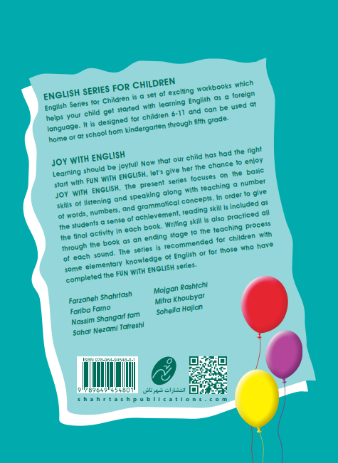 Joy with English series: Learning should be joyful! Now that your child has had the right start with Fun with English, let’s give her/him the chance to enjoy Joy with English. The present series focuses on the basic skills of listening and speaking along with teaching a number of words, numbers, and grammatical concepts. In order to give the students a sense of achievement, reading skills is included as the final activity in each book. Writing skills is also practiced all through the book as an ending stage to the teaching process of each sound. The series is recommended for children with some elementary knowledge of English or for those who have completed the Fun with English series. The alphabet order in these books are as follows